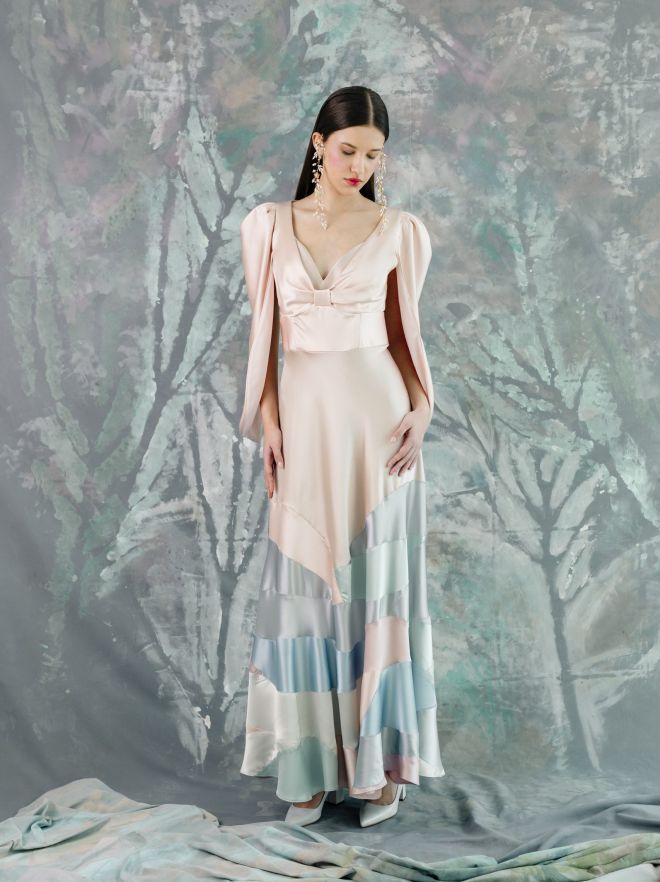 En mis colecciones me encanta crear con chifones, gasas, tules, satenes, encajes y jacquards, materiales que aportan movimiento y juego de tonalidades a cada diseño.