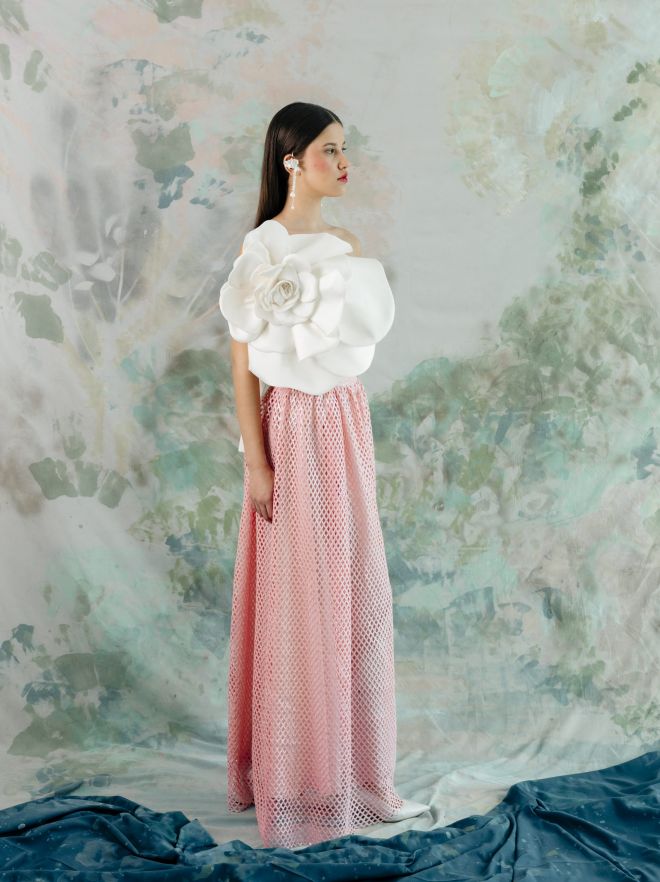 Busco realizar una producción sostenible y consciente, evitando el desperdicio de materiales. Empleo la técnica que llamo luxury recycling: elaboro paneles únicos a partir de restos de encajes y tejidos vaporosos, logrando piezas con carácter y sello de lujo artesanal.